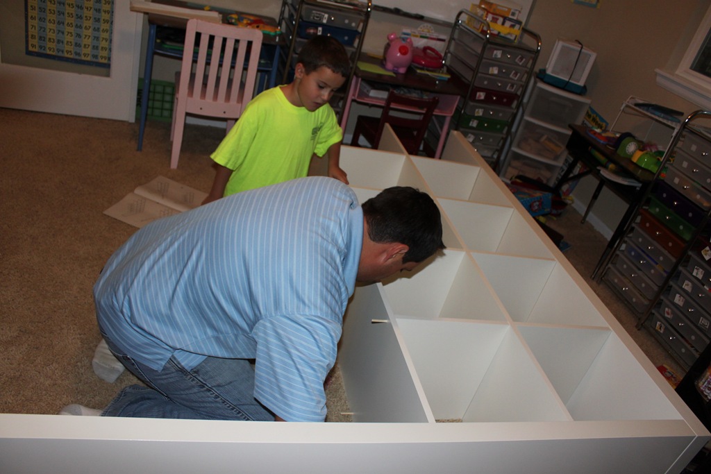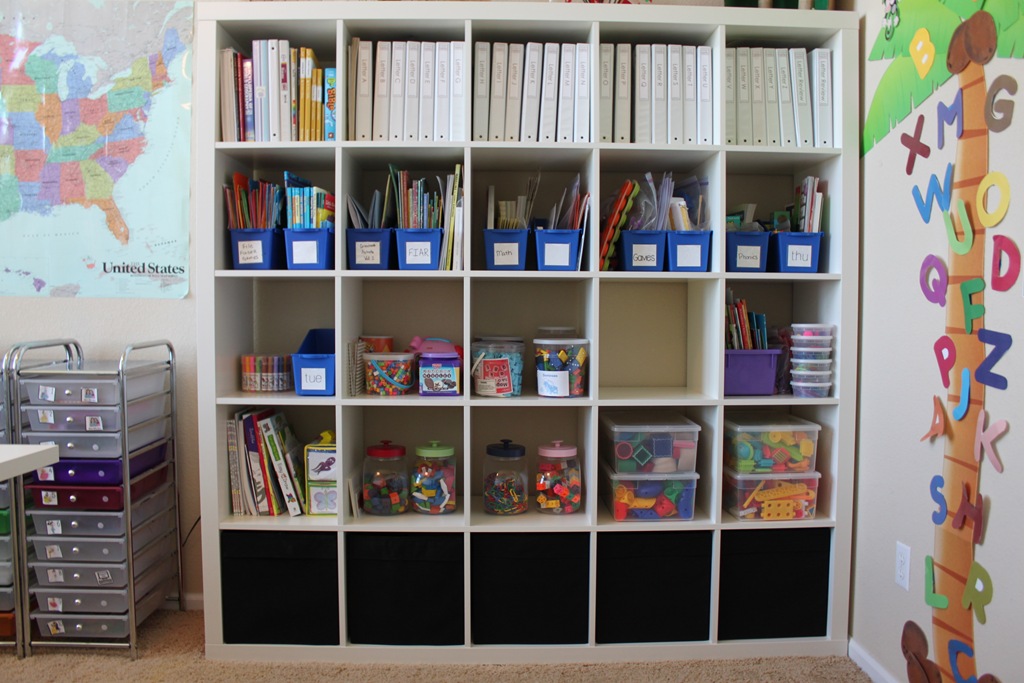 I used my old cube system from Target for my Teacher’s Manuals, the old bookshelf for games and such, then proceeded to fill my new Ikea Expedit Wall Shelf full of goodies.