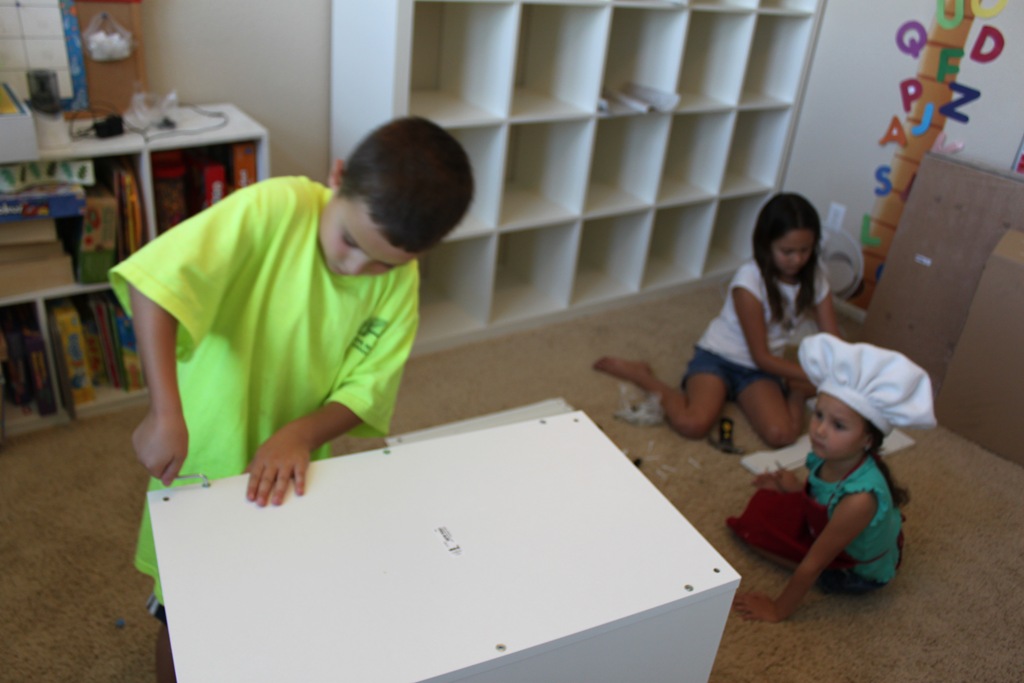 What’s this whole setup include? I’m not advertising for Ikea here, but I figured some of you may want to know how to put this thing together yourself. They also have table legs you could use instead that are much less expensive, as well as Amon Shelves that are cheaper too. They also have different colors and sizes. What inspired me to go white with four young children and a bunch of enticing markers in the middle of the table is beyond me.
