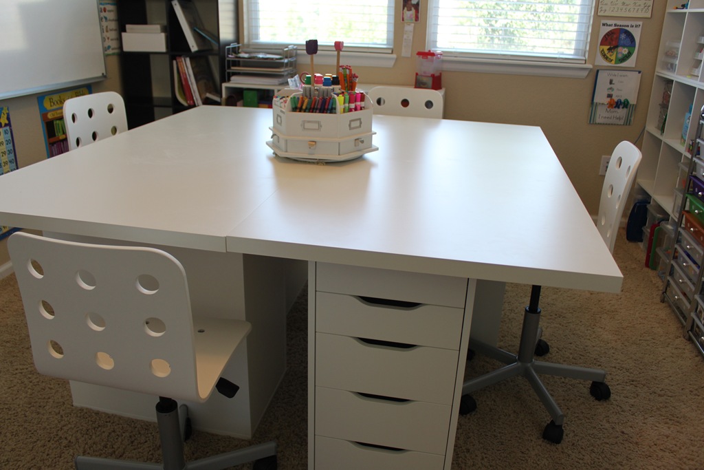 Here’s a close-up of the drawers and chairs for you. I turned them all in a pin-wheel pattern so that one set of drawers is facing each student. I’m strongly considering getting a glass top cut for this to protect all my whiteness, but that’ll have to come later as budget allows.