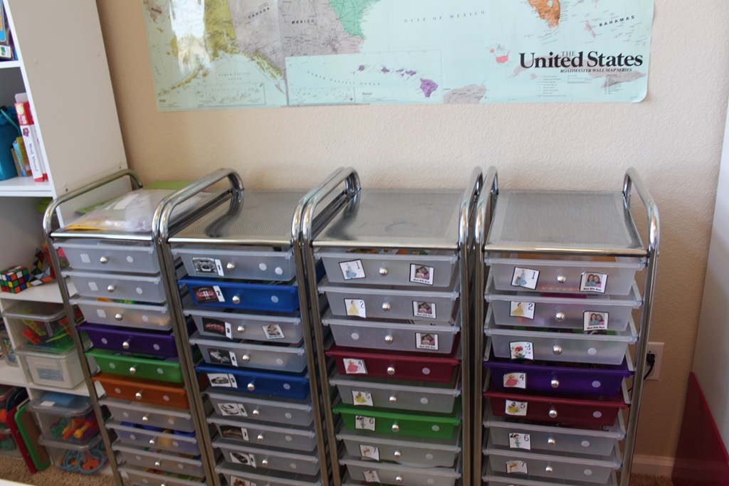And don’t worry, I didn’t ditch my workboxes, they’re still in the room. I was planning to use the Ikea drawer units for my workboxes, but couldn’t part with the 10-drawer ones I’ve used for the past 2 years, so for now the Ikea drawers hold their larger books and supplies like pencils, scissors, glue etc. That way people aren’t fighting over those things and they’re readily available in their top drawer.