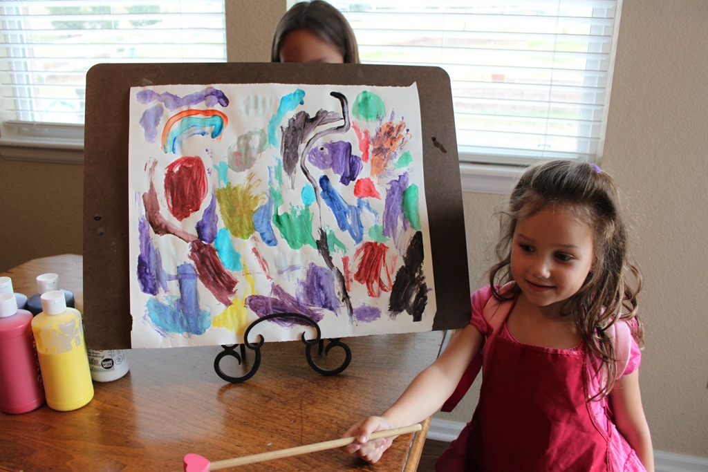 I’m not sure exactly which style the Teeny Tot was going for here, but she definitely had a great time. She went through several sheets of paper. She seems conflicted though, her painting is quite dark and dreary, while her face has a lovely smile on it…darn artists, you can never tell with them.