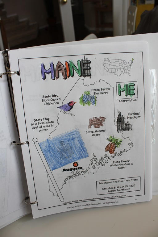 We added Maine to our small wall map. ( Trend USA Wall Poster)  (I just purchased two of these then cut out the states on one of them, and left one whole. Then I added small velcro dots to both the whole map and the little pieces so we could add our states as we went.