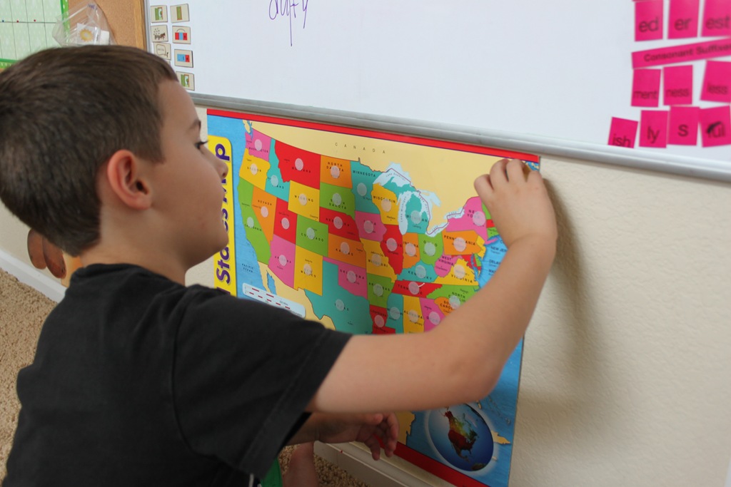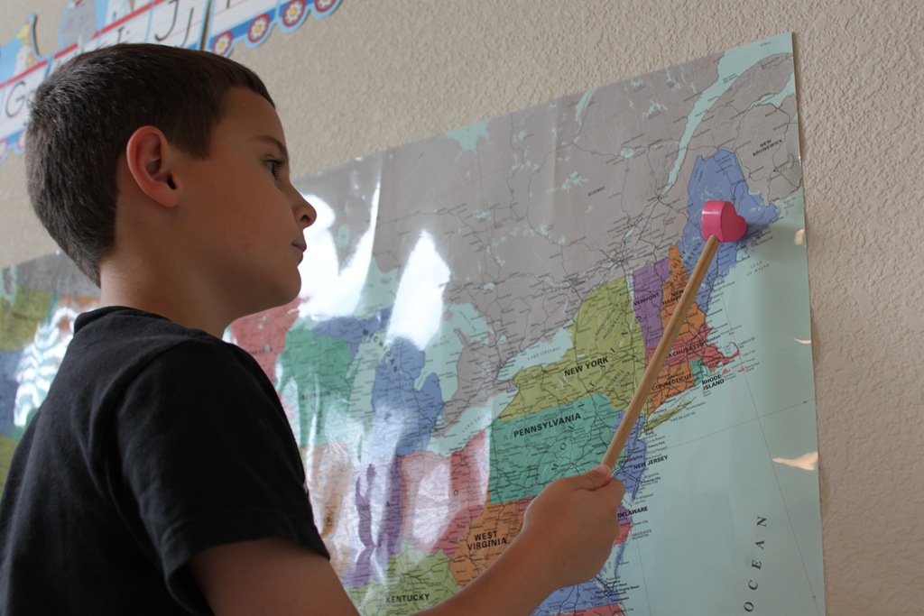 We started off by reviewing the states and capitals we’ve learned so far, then located Maine and Augusta on our Wall Map.