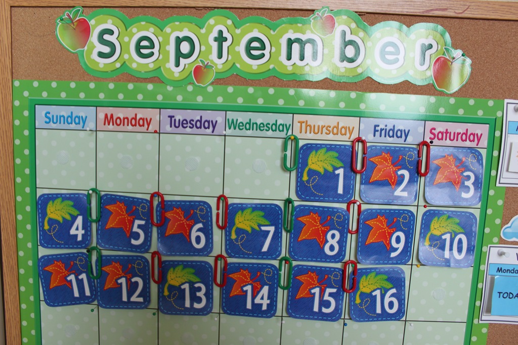 Each day we add today’s number card on calendar, then count up to that number. We also put up our colored math link to continue our pattern for the month. We also say the complete date: “Today is Friday, September 16, 2011”