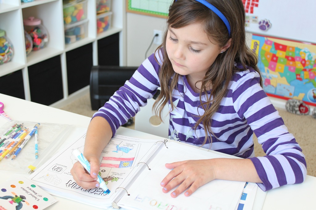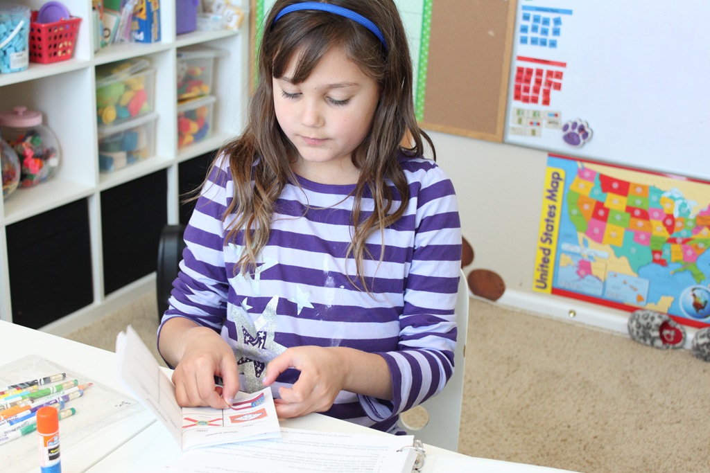 I have their notebook already printed and they just open to whatever page we’re on for the day. On our review day, they do the mini-books themselves and add them to that region’s divider sheet.