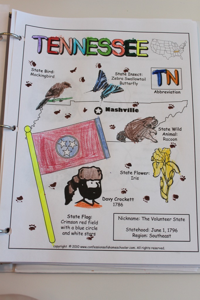 As we read through our state facts, the kids color in the state worksheet. Here is our page on Tennessee with some nice little raccoon tracks all over it apparently.