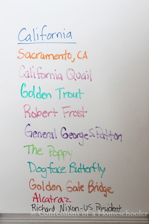 Here is my white board for the week, we use this to review all of the state facts and symbols each day.