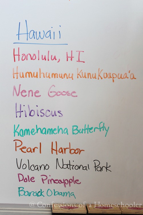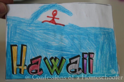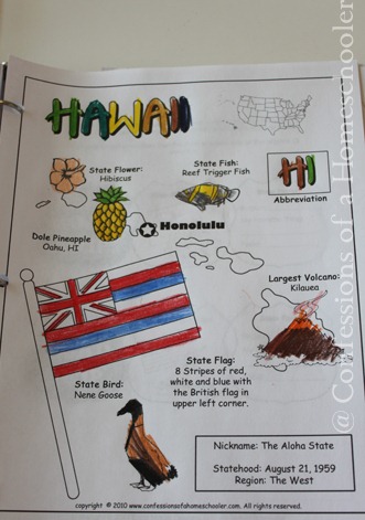 We took turns locating Honolulu, Hawaii in our National Geographic Atlas. Then we all completed the Hawaii state worksheets as we read through all of the Hawaii state facts in our curriculum: