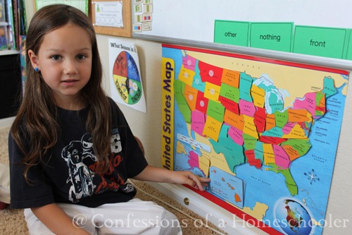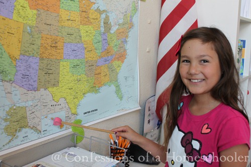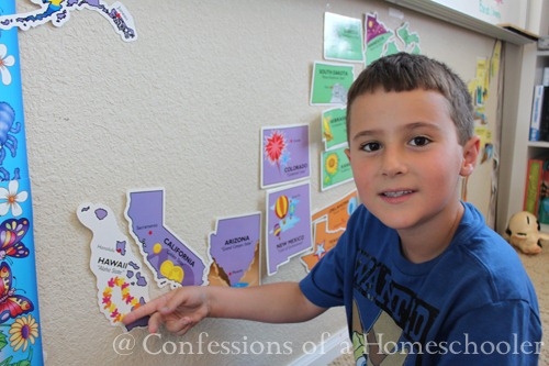 Then Turbo had the honor of adding the state to our wall map. I’ve had lots of questions on this, and the directions are in the curriculum, but we purchased two of these Trend USA Wall Maps and then simply cut one up into states, then used small velcro dots to attach them as we travel through our state study.