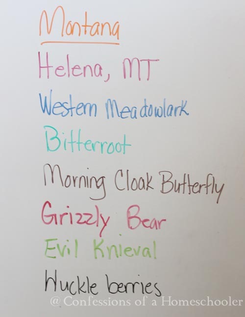 Tinker Bell added Montana to our United States Bulletin. After that we reviewed all of the states we’ve learned so far on our travels.
