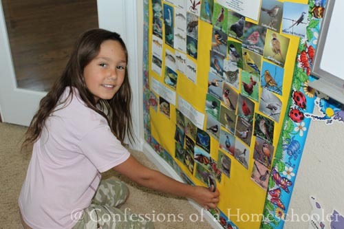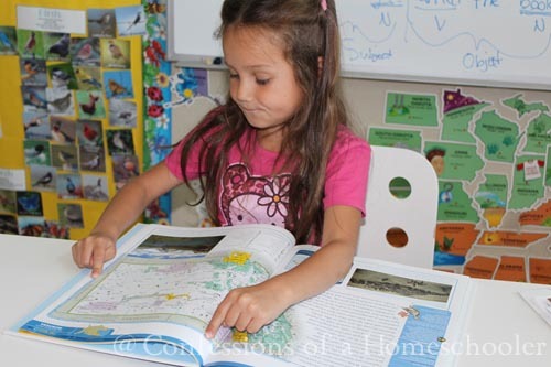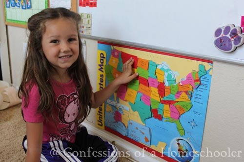 Then Tinker Bell had the honor of adding the state to our wall map. I’ve had lots of questions on this, and the directions are in the curriculum, but we purchased two of these Trend USA Wall Maps and then simply cut one up into states, then used small velcro dots to attach them as we travel through our state study.